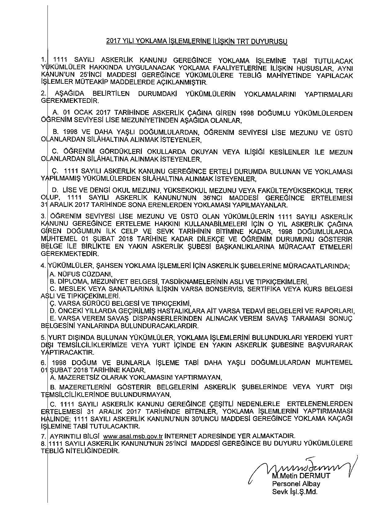 1111 sayılı Kanun gereğince, 1998 doğumlu ve bu doğumlularla işleme tabi yükümlülerin yoklama işlemlerine ait tebliğ yerine geçecek duyuru, Milli Savunma Bakanlığından alınmakla ekte sunulmuştur.