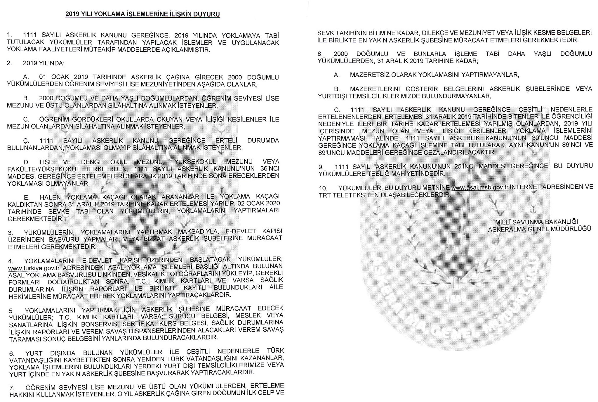 1111 sayılı Askerlik Kanunu gereğince,2000 doğum ve bu doğumlularla işleme tabi yükümlülerin yoklama işlemlerine ait tebliğ yerine geçecek duyuru, Milli Savunma Bakanlığından (MSB) alınmakla ekte sunulmuştur.
