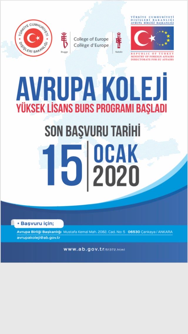Burs için son başvuru tarihi 15 Ocak 2020 olup ekli burs başvuru formu www.ab.gov.tr adresinden de temin edilebilecektir. Avrupa Koleji Yüksek Lisans Programlarına kabul için ise, Avrupa Koleji internet sitesine (www.coleurope.eu) 1 Ekim 2019 - 15 Ocak 2020 tarihleri arasında online başvuru yapılması gerekmektedir.