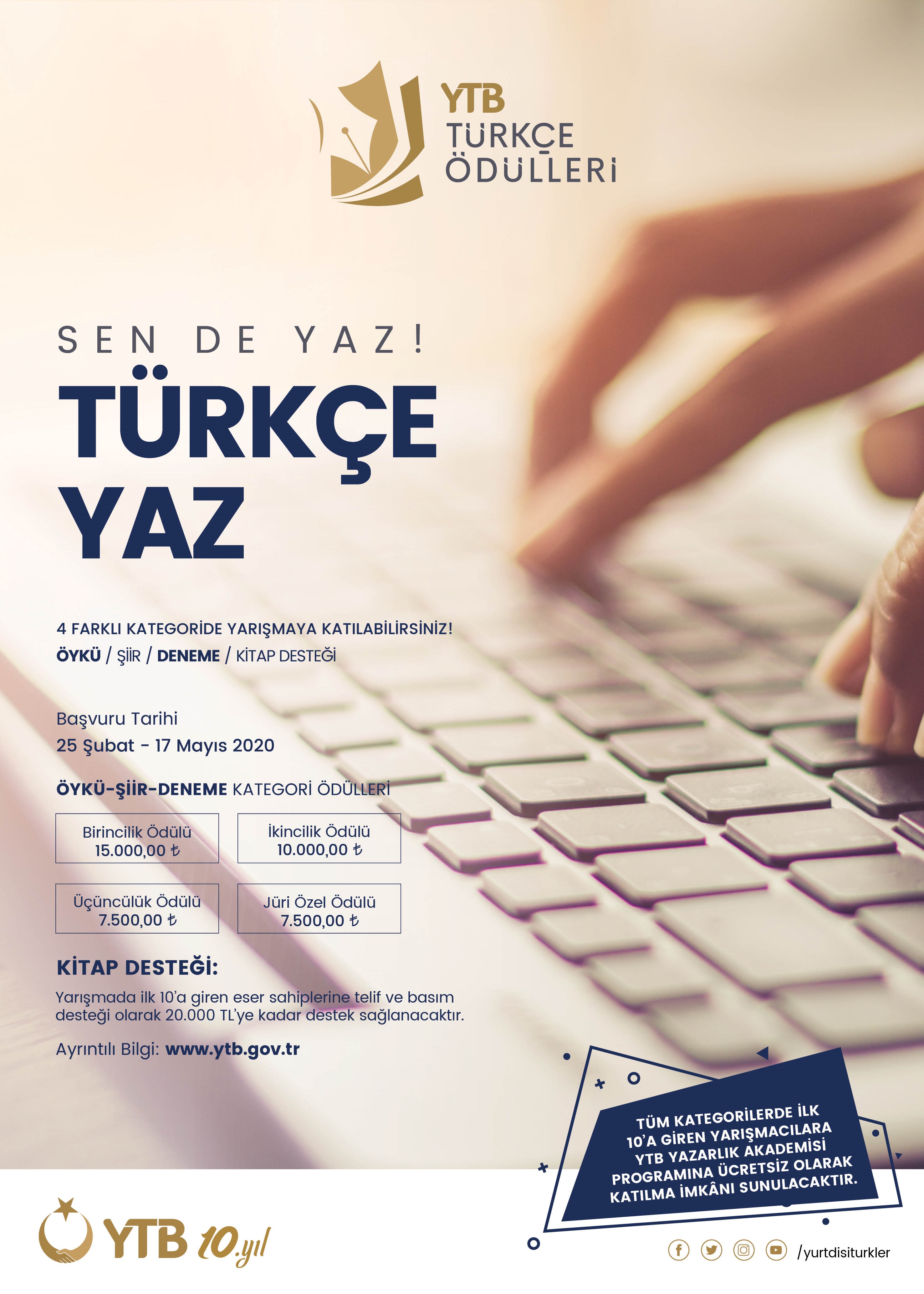 Yurtdışı Türkler ve Akraba Topluluklar Başkanlığından (YTB)alınan bir yazıda, yurt dışında yaşayan vatandaşlarımızın anadil konusundaki yetkinliklerini ve ifade kabiliyetlerini artırmak, kendi kültürel birikimlerini ortaya çıkarmak, Türk diasporası edebiyatı alanına yeni açılımlar kazandırmak ve yurt dışında yaşayan Türkler tarafından kaleme alınan Türkçe edebi eserlerin çeşitlenmesini teşvik etmek amacıyla "YTB Türkçe Ödülleri" adı altında bir ödül programı geliştirildiği, programın öykü, şiir, deneme ve kitap desteği olmak üzere 4 ayrı kategoride gerçekleştirileceği ve her kategori için ayrı seçici kurul oluşturulacağı, tüm kategorilerde derece elde eden katılımcılara çeşitli ödüller takdim edileceği, programla ilgili detaylı bilgiye "https://www.ytb.gov.tr/guncel/2020-ytb-turkce-odulleri-yarismasi" adresinden ulaşılabileceği bildirilmektedir.
