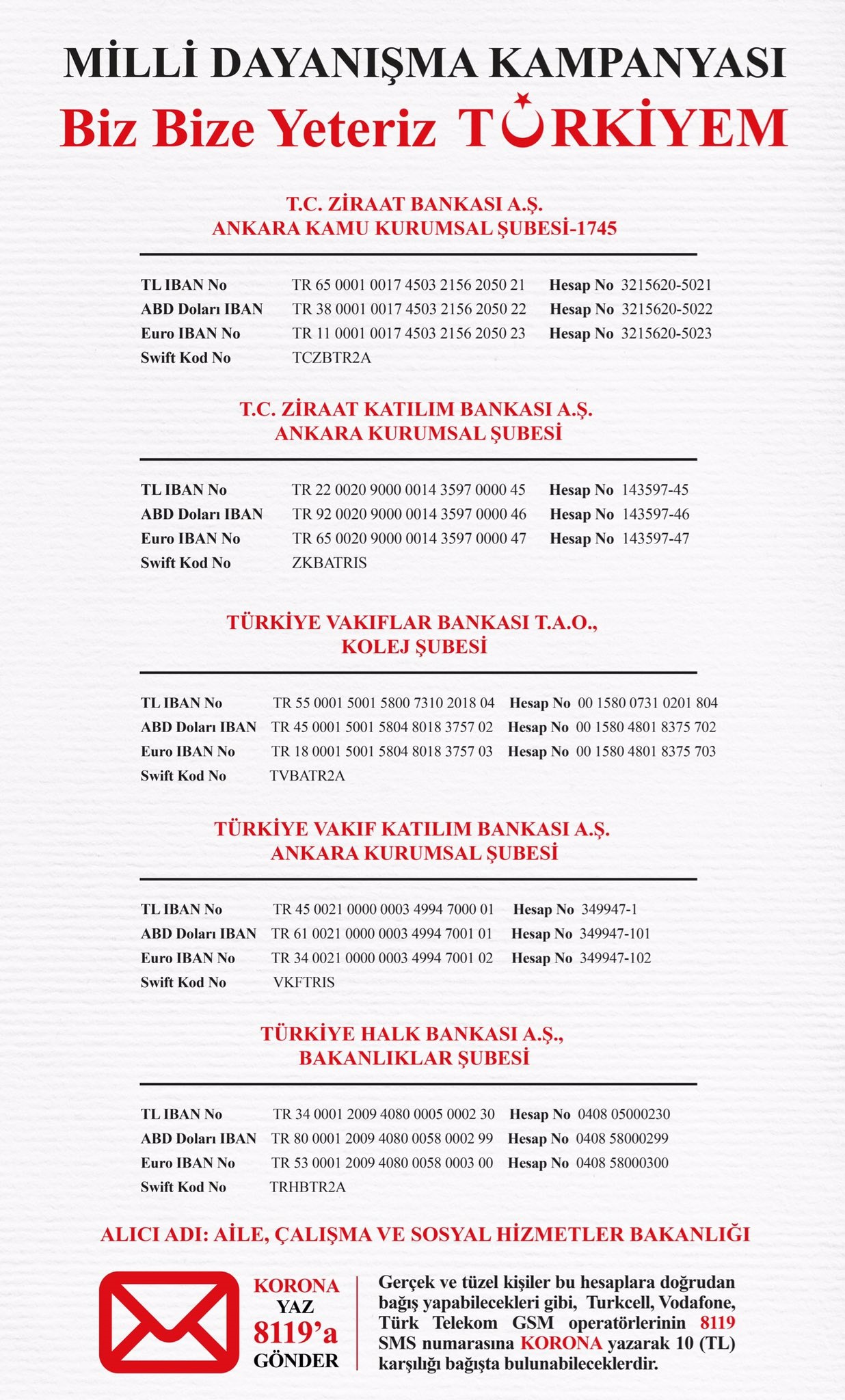 "Biz Bize Yeteriz" Milli Dayanışma Kampanyası Banka Hesap Bilgileri (Duyuru No. 17)