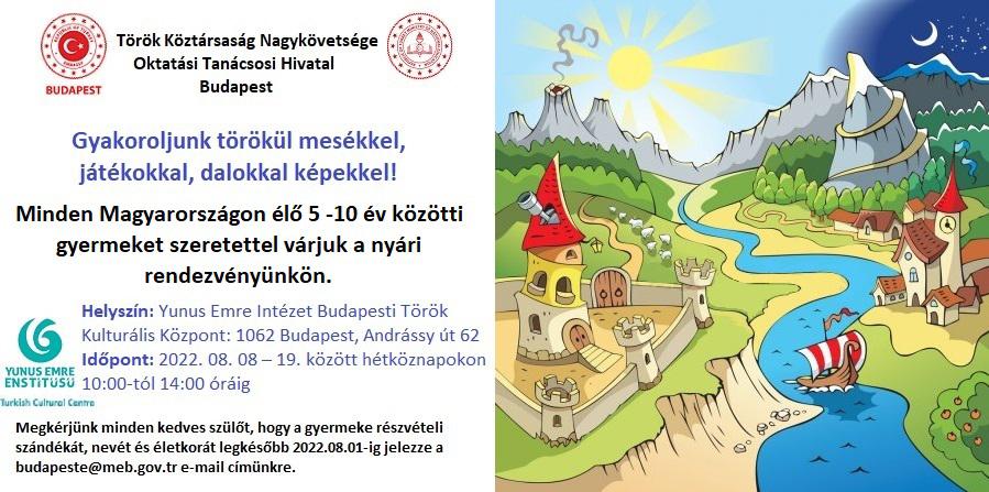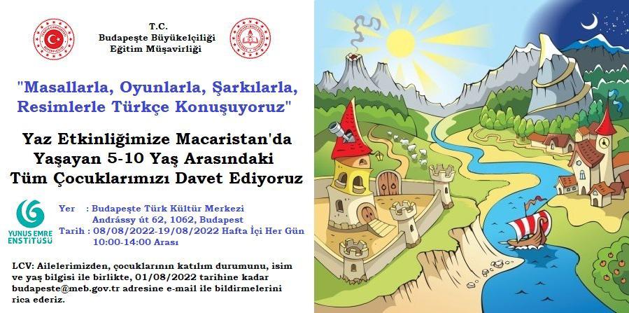 Büyükelçiliğimiz Eğitim Müşavirliğince, 8-19 Ağustos 2022 tarihleri arasında,Budapeşte Yunus Emre Türk Kültür Merkezi’nde (Adres: Andrássy út 62, 1062 Budapeşte) Macaristan’da yaşayan 5-10 yaş arasındaki çocuklarımız için yaz etkinliği yapılması planlanmaktadır.